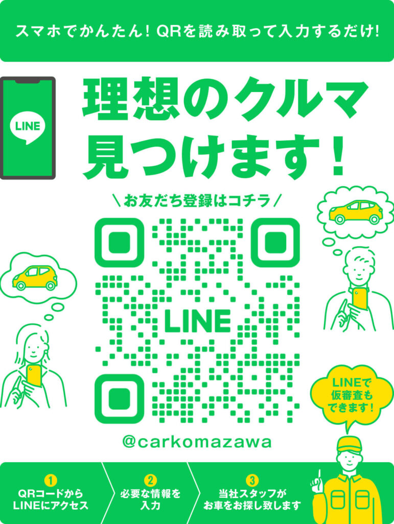 在庫車両の確認やお見積りのご依頼はもちろん、「この車ってまだありますか?」「ローンの相談がしたい」「この車を探している」など、ちょっとしたご質問やご相談にもLINEから気軽にご連絡いただけます。 わざわざ電話するのは面倒…という方でも、LINEならスキマ時間にサッとやり取りできて便利!ご希望の車が入荷した際には、LINEでのご案内も可能です。 お客様に寄り添ったスムーズなやり取りを心がけておりますので、ぜひこの機会にLINE登録をしてご活用ください。